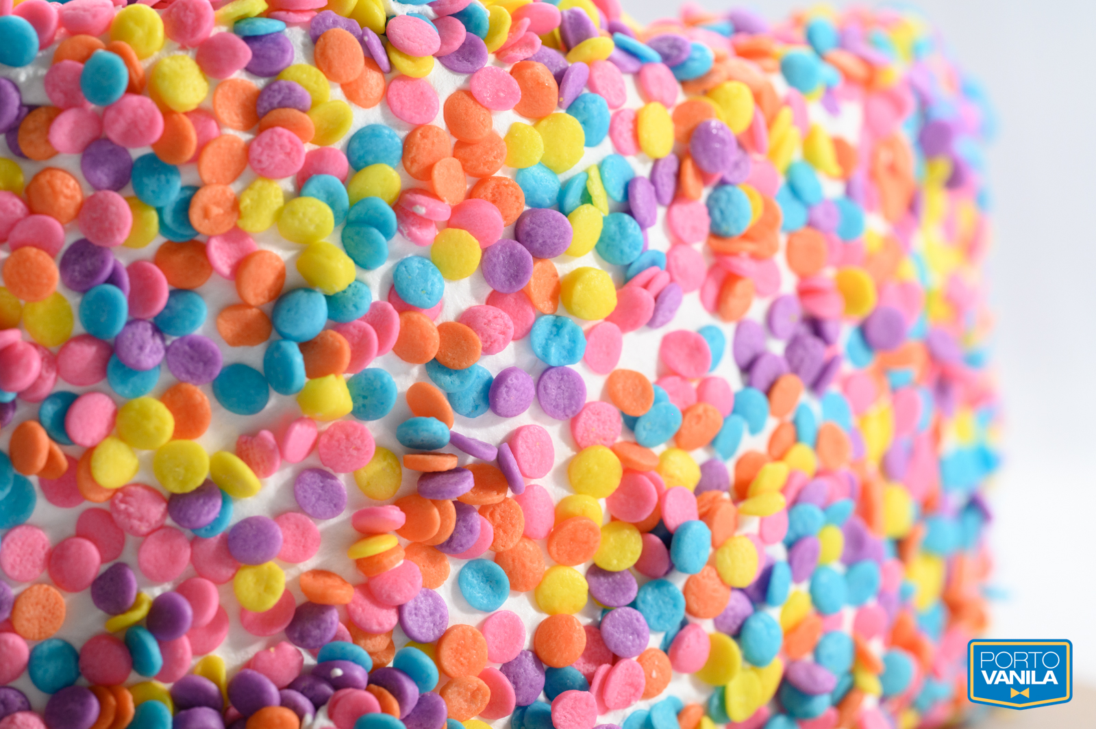 Torta con bizcochuelo de vainilla, relleno de dulce de leche y decorado con merengue y grajeas de colores